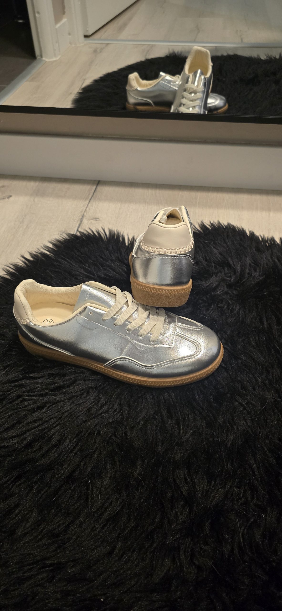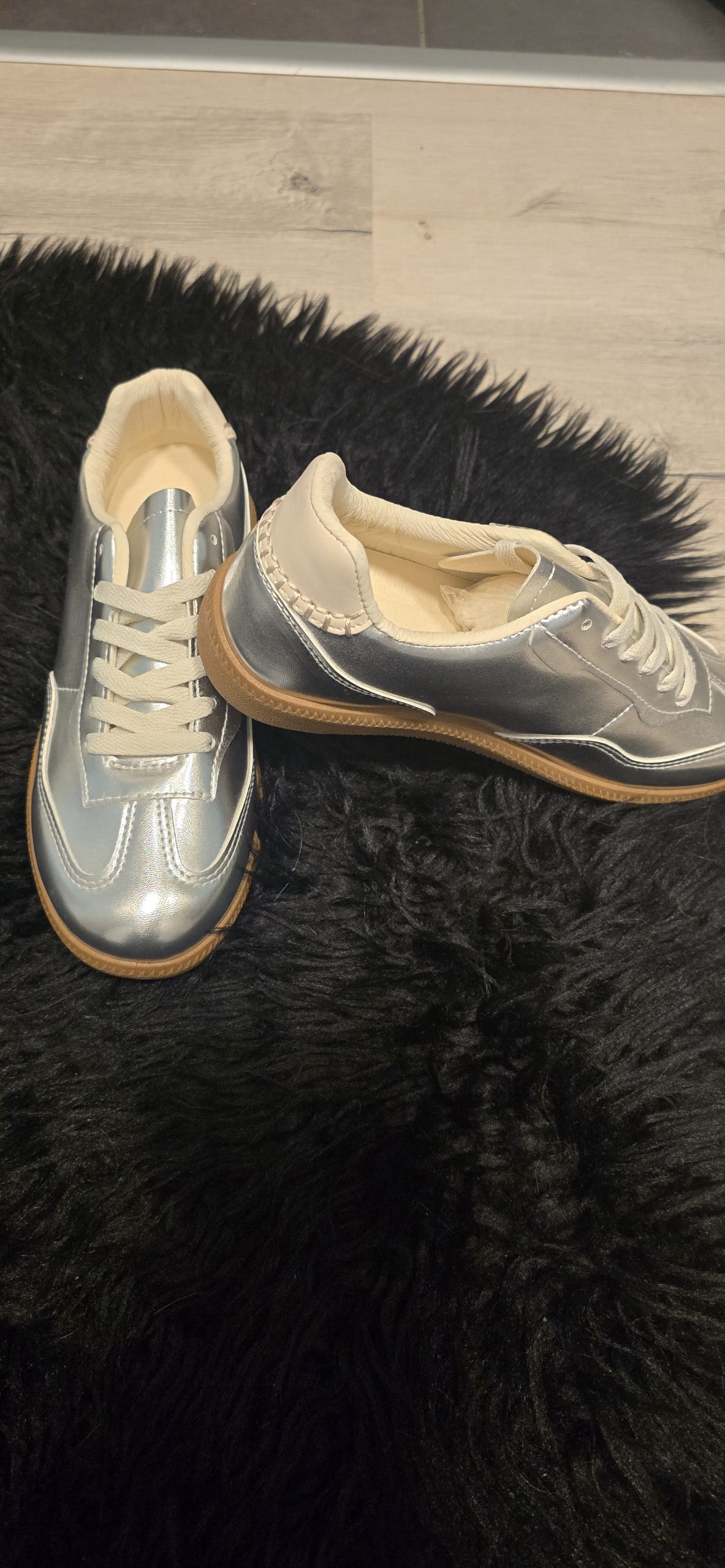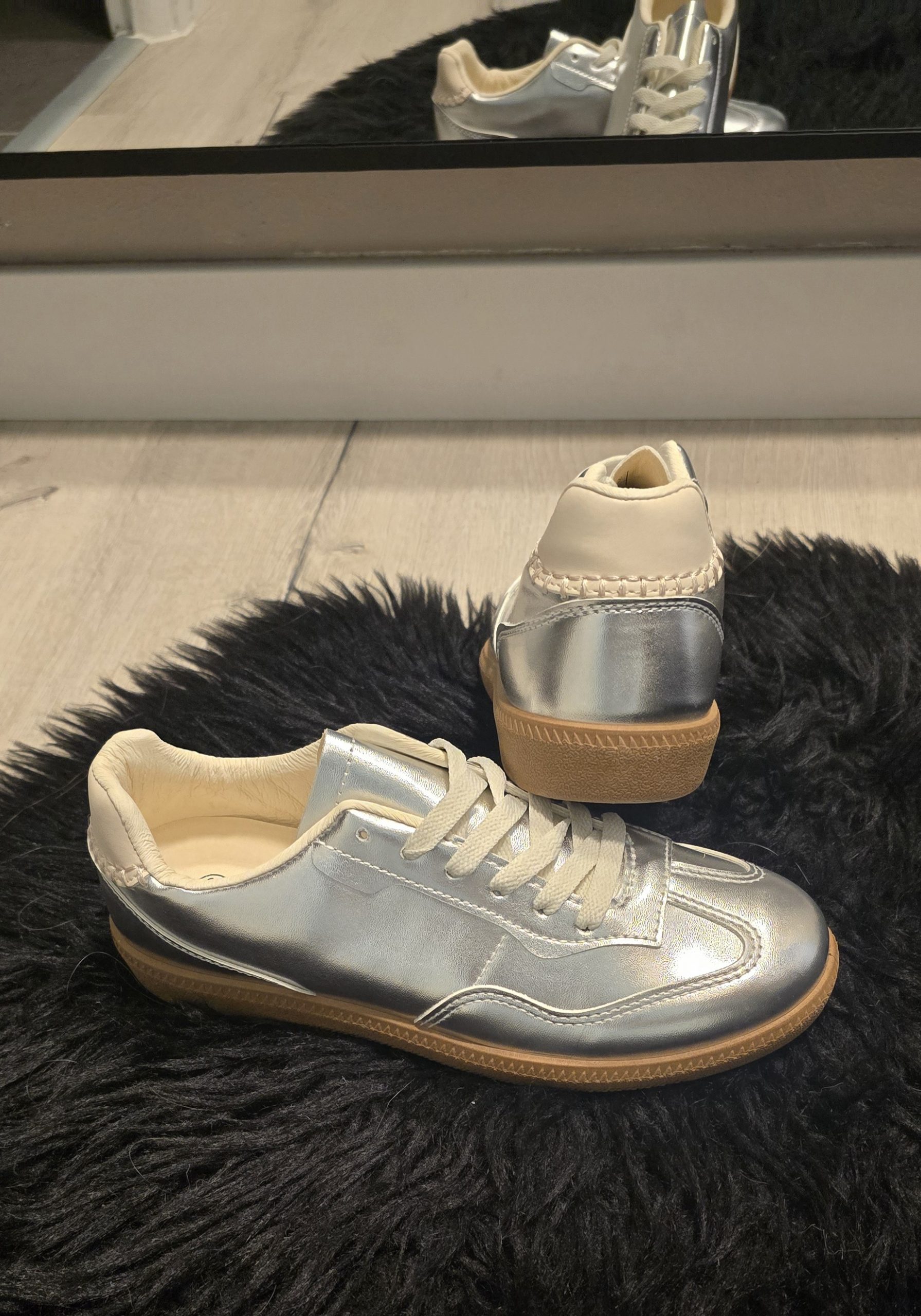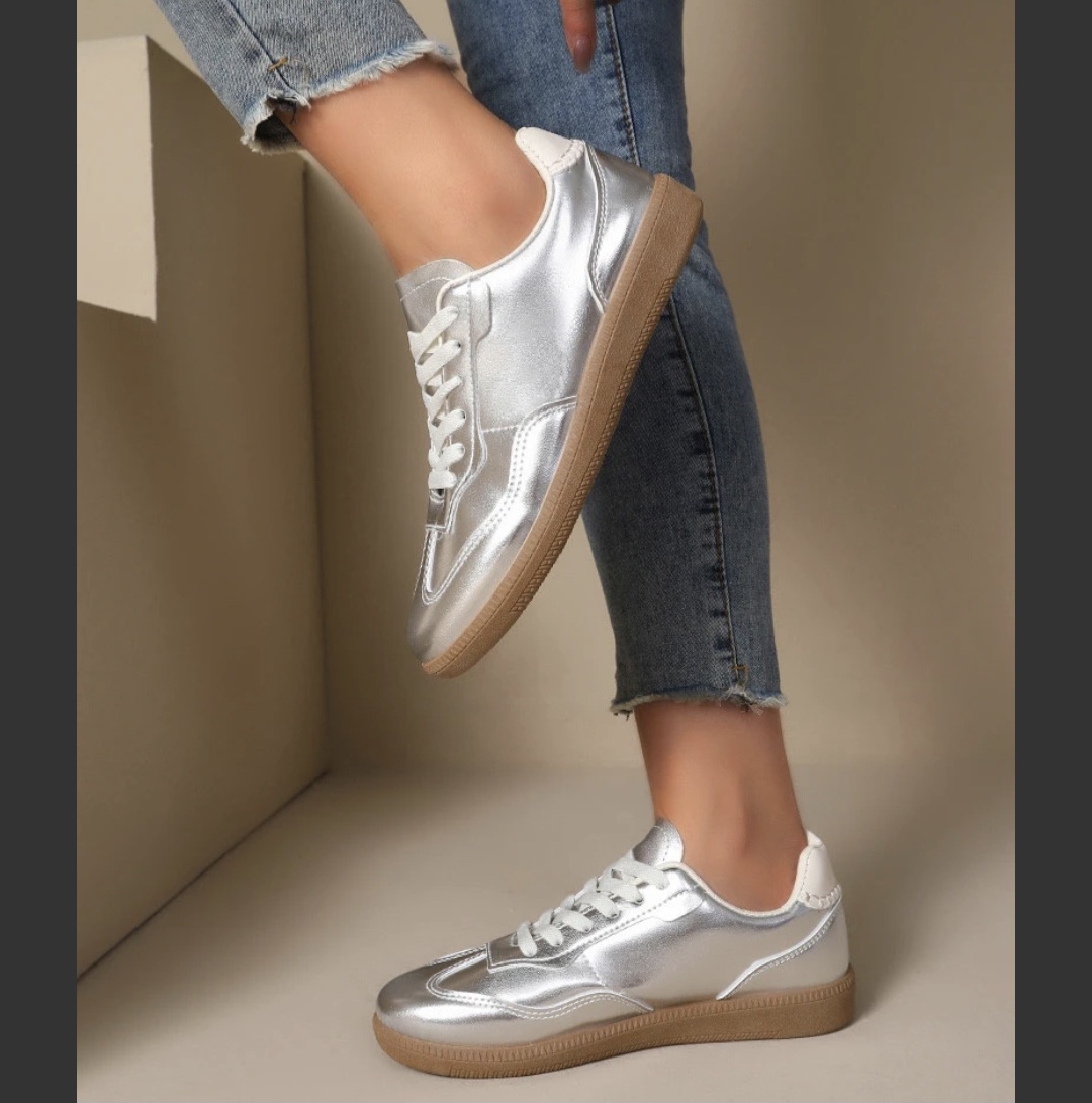 Baskets basses argentées métalliques, tendance et confortables.