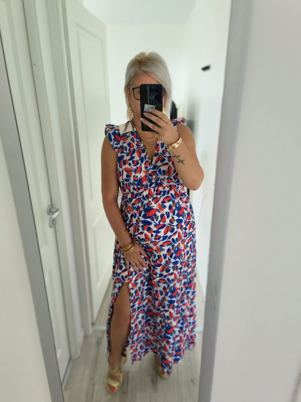 Apportez fraîcheur et éclat à votre garde-robe avec cette robe longue colorée pour femme. Son imprimé vif aux tons bleu, rouge et blanc illumine la silhouette, tandis que sa coupe fluide et sa fente subtile sur le côté apportent confort et féminité.